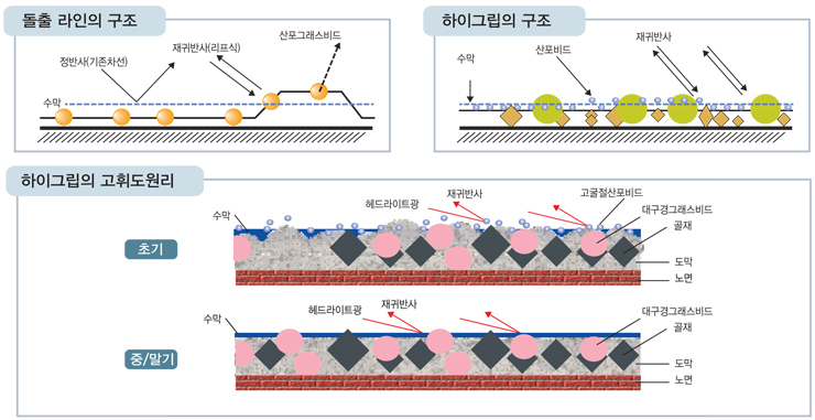 하이그립은 돌출에 의한 야간우천시의 시인성확보가 아닌 대구경 고굴절 비드와 미끄럼방지용 골재가 수막 형성을 억제하여 돌출부 없이 야간 시인성을 확보하여 안전운전에 기여하게 된다.