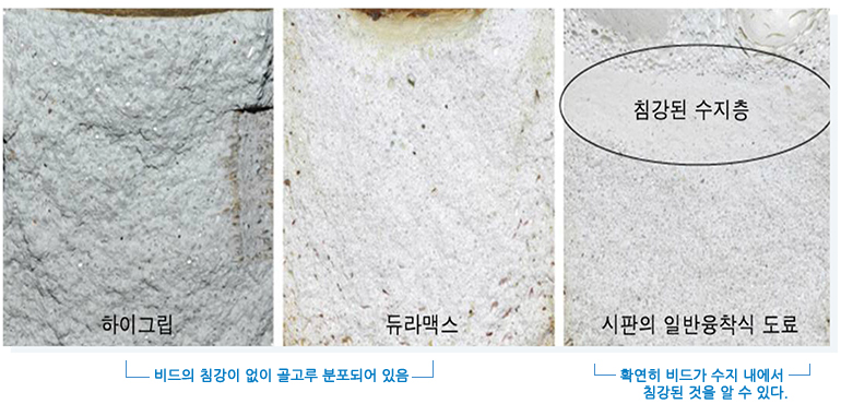 2. 비드가 도막면에 고르게 산포되어 시인성이 기존 제품과 확연한 차이가 있다.
