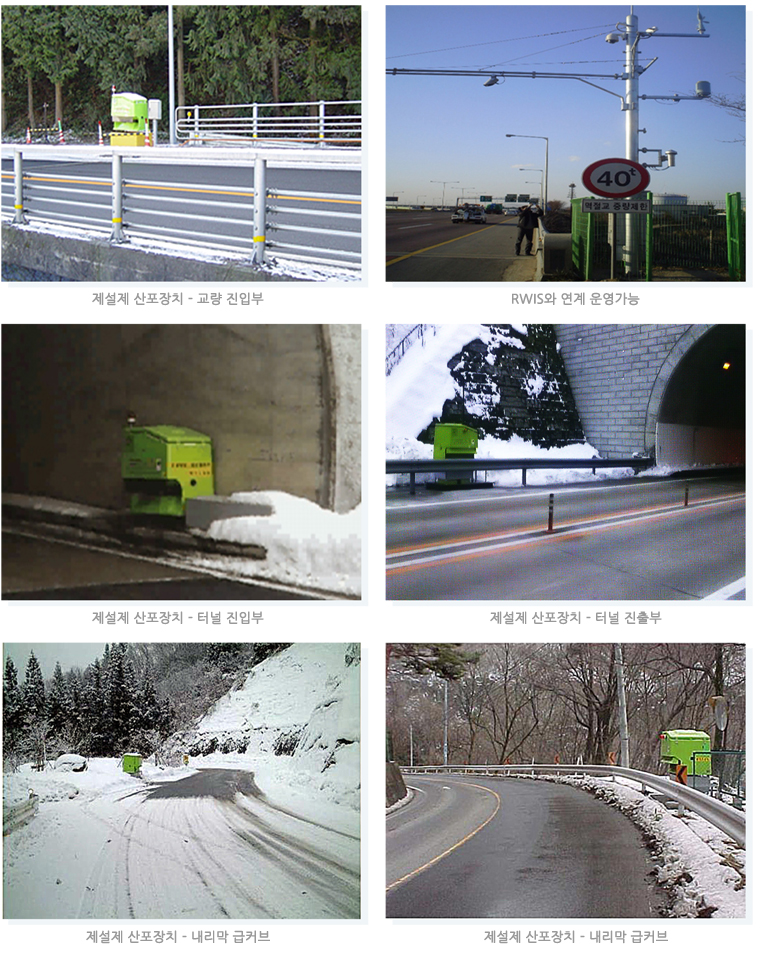 본 장치는 도로에 정치하는 방식으로, 동절기에 제설제 및 동결방지제를 자동으로 산포하는 장치이다. 본 장치는 당사의 노면상태 검지기와 CDMA통신으로 연동을 권장한다.